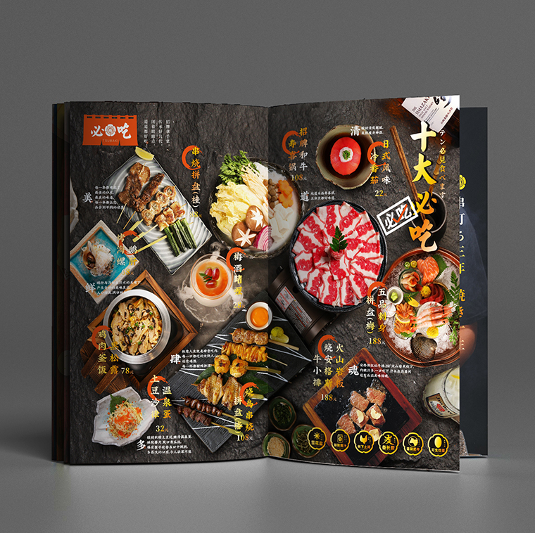因此,品深餐飲全案設計中,菜譜不僅要實現營銷型的經營功能,還要塑造品牌的價值,體現品牌核心優勢。品深餐飲一貫堅持通過招牌菜品、核心菜品合理分布排序,讓消費者在前6頁完成點單需求,化被動選擇點菜為主動營銷,從而讓菜譜達到提升指定菜品點擊率,打造明星菜品,提升人均或控制人均消費目的。