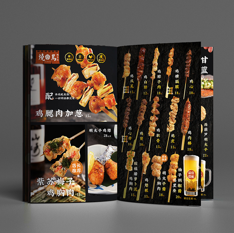 工作內容:日本料理燒鳥居酒屋菜譜規劃,日本料理菜譜編排設計,日本料理燒鳥菜品文案話術撰寫,燒鳥料理居酒屋菜譜印刷裝訂。