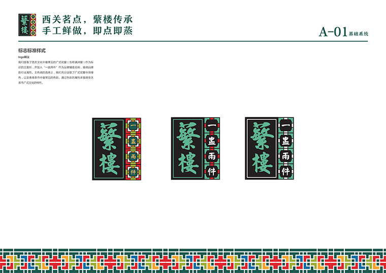 蘩樓兩個(gè)字在日常中很少看見,認(rèn)識的人不多,但是一旦認(rèn)識了,識別度非常高。品深設(shè)計(jì)方法論認(rèn)為:優(yōu)秀的標(biāo)識logo首先應(yīng)該傳達(dá)品牌屬性,其次是承載品牌的文化,再次是很容易識別和傳播。我們提取了西關(guān)文化中最常見的廣式花窗(也稱滿洲窗)作為標(biāo)識的主圖形,并加入“一盅兩件”作為品牌輔助說明,強(qiáng)調(diào)品牌的行業(yè)屬性。