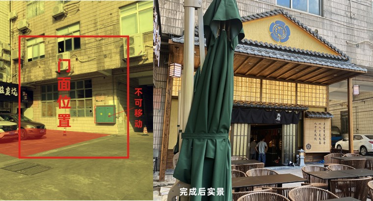 玉椿燒鳥居酒屋首店位于深圳的餐飲網(wǎng)紅高地——車公廟十畝地正對(duì)面。門店之前是一家中餐的后廚的全部空間及部分包間,其中一半的面積屬于上一家餐廳自己搭建的二層。空間結(jié)構(gòu)非常復(fù)雜,地面高地不平,尤其是搭建部分的1層,2層實(shí)際高度不到2.5米,心理感受很逼窄,這個(gè)場(chǎng)地極為