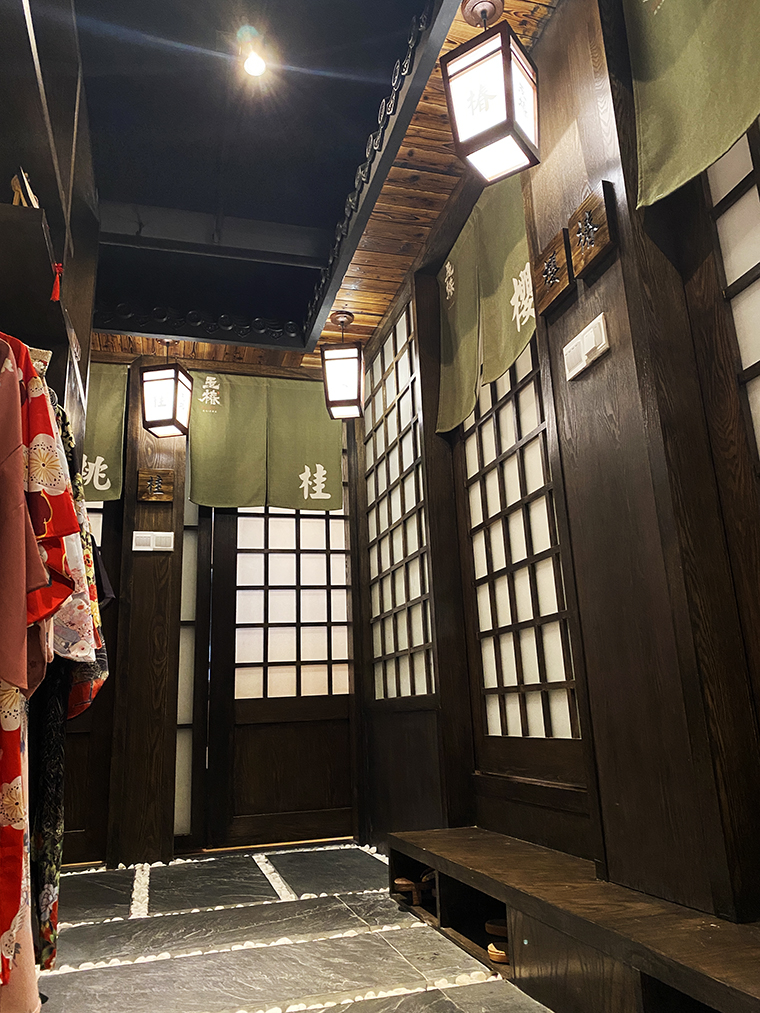 二樓除了必備的洗手間、儲(chǔ)物柜外,還設(shè)置了和服展示區(qū),這是餐飲娛樂化的一大重要趨勢(shì)。