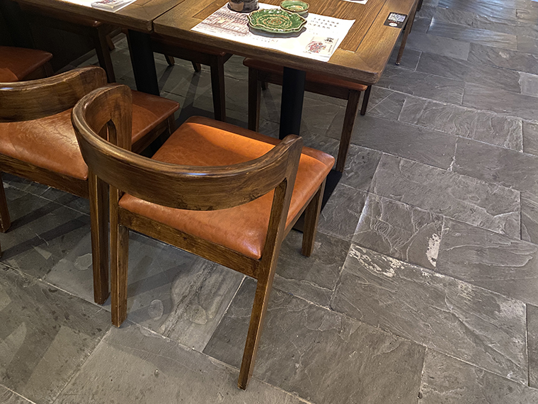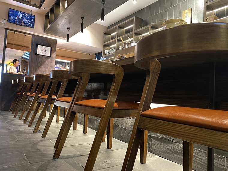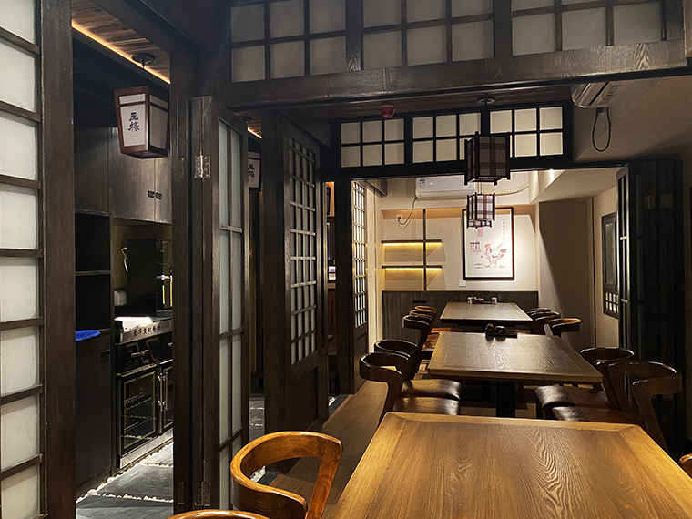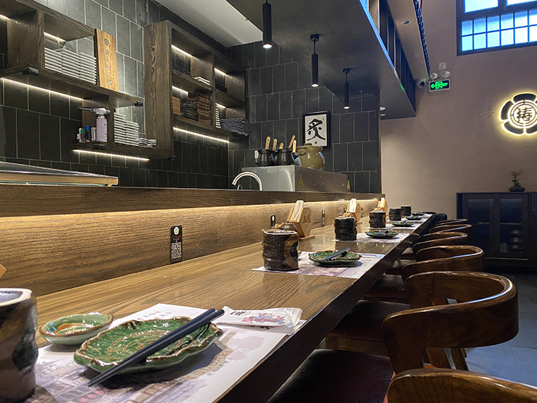 為了營(yíng)造京都風(fēng)格的空間感受,品深餐飲為玉椿設(shè)計(jì)定制的家具采用了實(shí)木材質(zhì),開放漆做舊工藝處理,呈現(xiàn)出一種江戶時(shí)代的歷史滄桑質(zhì)感;與門店的招牌匾額,儲(chǔ)存柜顏色完全一致,顧客使用時(shí)候的歷史