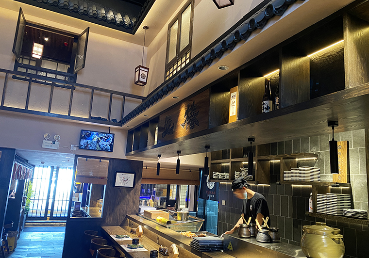2、一樓大廳及吊頂?shù)脑O(shè)計(jì):把京都的古老街道,巷子搬到我們店里。整個(gè)大廳的頂部環(huán)繞一圈日式黑瓦頂,四周幾個(gè)日式玻璃木窗,與地面的青石瓦面,墻體的稻草漆,燒烤吧臺(tái)形成一體化的京都風(fēng)格。置身其中,仿佛