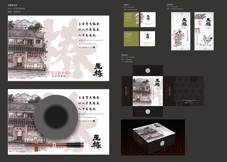 我們希望透過這個(gè)書法文字的LOGO標(biāo)識(shí)及輔助的家徽?qǐng)D案塑造玉椿經(jīng)典的日式美學(xué)氣質(zhì)和料理文化底蘊(yùn)。表達(dá)品牌傳承百年,初心如一的愿景,使之成為指引玉椿品牌前進(jìn)的燈塔。玉椿燒鳥居酒屋,將“