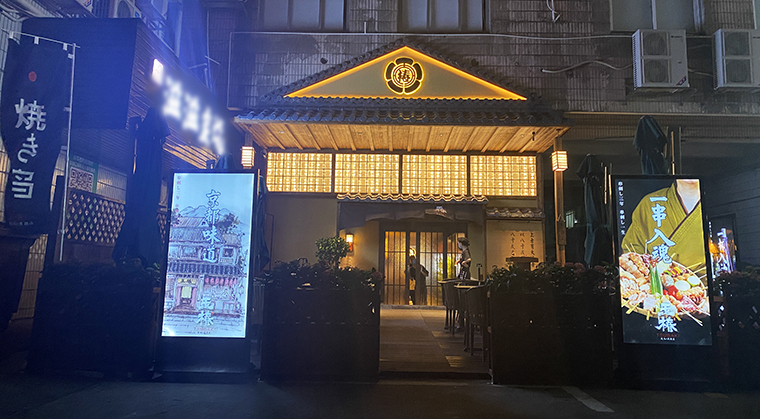 比如玉椿燒鳥居酒屋的門頭,使用京都古建筑的山墻造型,中間裝飾“椿”的家徽,既表達品牌名稱,又有強烈的復古氣質,極具日本江戶時代特征。中間一排玻璃磚是整個門頭的點睛之筆,方形玻璃磚,厚度達到50MM,燈光照射下有一種晶瑩剔透的視覺感受,現代時尚氣息濃厚。方形玻璃磚與門頭的復古氣質形成強烈對比。古典與現代碰撞,迸發出耀眼的視覺火花,消費者的眼光一下子就被吸引過來,并且迅速產生了一種迫切想進店的消費沖動。這就是借助造型藝術體現品牌屬性,靈活使用裝飾材質的特性,實現了古典與現代的交融。