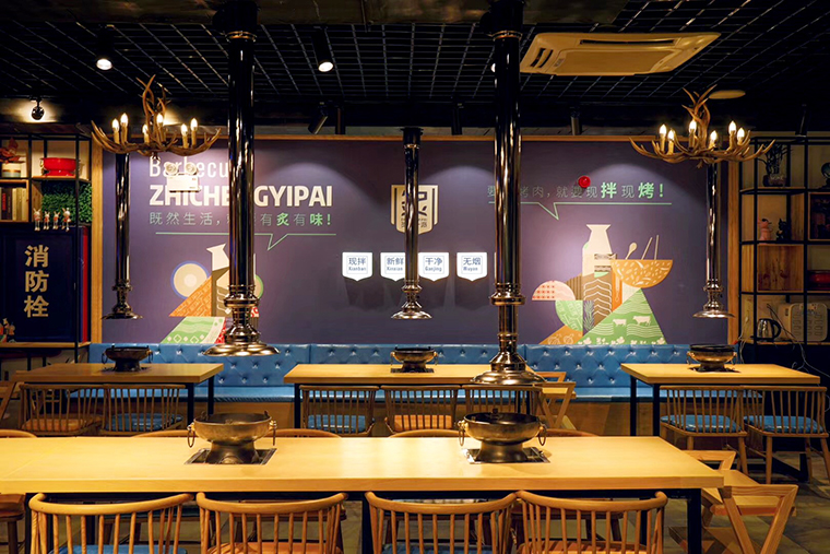 品深餐飲設計認為:炙成一派作為海口首家現拌烤肉店,具有明顯的市場先發優勢,在空間中應通過氛圍體驗,品牌訴求,在消費者心目中植入現拌烤肉就是炙成一派,將品牌等同于品類。通過空間的視覺體驗,燈光感受,食物的味道,家具軟裝的觸感體驗,讓消費者能放松心情,享受美食,有情懷,有情調,有趣味。消費者置身其中,心靈宣泄,釋放壓力,最終產生品牌的粘性和較高的復購率。