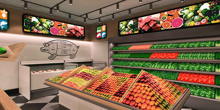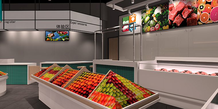 社區生鮮連鎖店裝飾裝修設計、生鮮連鎖店形象設計、生鮮連鎖店軟裝燈光設計。