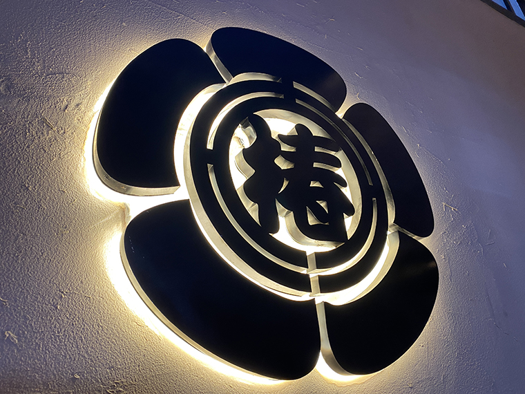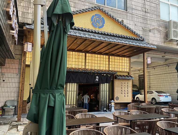 門口的日式推拉門、地?zé)?、青石板、椿花樹、炭黑色的日式布簾、遮蓋燃?xì)獗硐潴w的竹制卷簾,整個(gè)門頭把日本京都特征表達(dá)地非常鮮明且形式經(jīng)典,識(shí)別度極高。